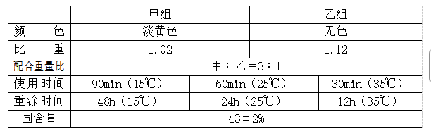按比例將甲、乙組份倒入攪拌桶后在較大的剪切力下攪拌均勻,建議每次配料6公斤以上時(shí)用電動(dòng)攪拌機(jī)攪拌均勻。待攪拌均勻后,再加入不超過甲組份重量20%的清水調(diào)節(jié)施工粘度。理論用量:0.12㎏/㎡(以干膜50μm計(jì)),實(shí)際用量與施工方法和基面的孔隙率有關(guān);建議在10℃以上使用本品。要求基面無浮水,空氣相對濕度小于85%。在狹窄空間內(nèi)施工和干燥期間,應(yīng)保持良好的通風(fēng)。空氣濕度大時(shí),確保良好的通風(fēng)也是必要的。直接涂在已處理好的基面上。